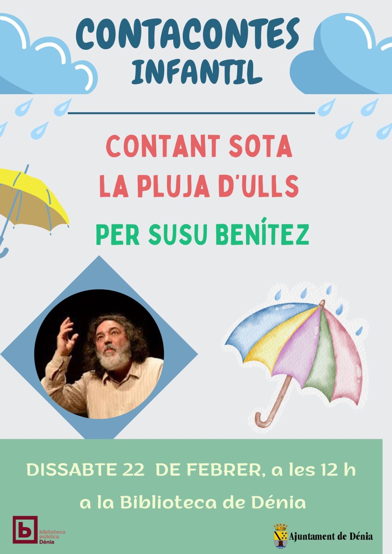 Cuenta cuentos para público familiar, Contant sota la pluja d’ulls, por Susu Benítez.Sábado 22 de febrero, a las 12 h, en la Biblioteca Pública (c/ de Sant Josep, 6)
