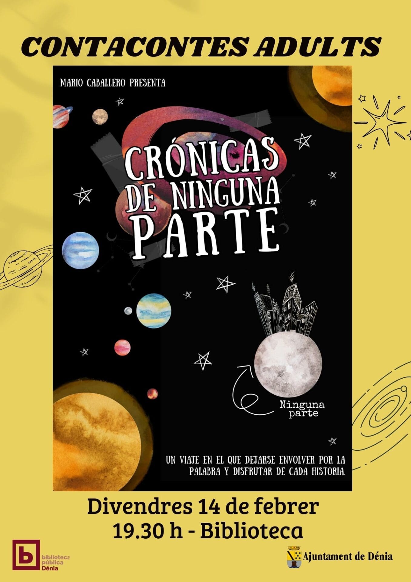 Cuenta cuentos para público adulto, Crónicas de ninguna parte, por Pàmpol teatre.Viernes 14 de febrero, a las 19.30 h, en la Biblioteca de Dénia (c/ de Sant Josep, 6)