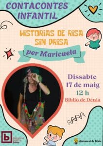 Cuenta cuentos infantil Historias de risa sin prisa, por Maricuela.Para público familiar.Os esperamos el sábado 17 de mayo, a las 12 h, en la Biblioteca de Dénia (c/ de Sant Josep, 6)