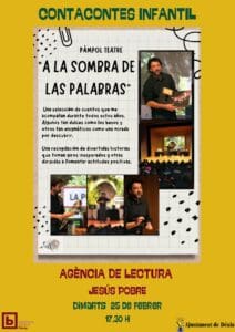 Cuenta cuentos infantil, A la sombra de las palabras, por Pàmpol teatre.Martes 25 de febrero, a las 17.30 h, en la Agencia de Lectura Enric Valor, de Jesús Pobre (Pl Pou de la Murtera, 4)