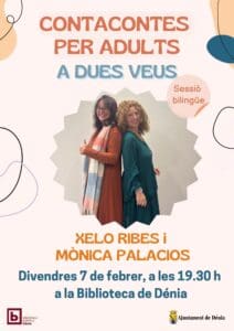 Cuenta cuentos para público adulto, A dues veus, Espectáculo a dos timbres de voz. Historias para ser contadas vibrando en cuatro cuerdas, con Xelo Ribes y Mónica Palacios. Sesión de cuentos bilingüe.Viernes 7 de febrero, a las 19.30 h, en la Biblioteca de Dénia (c/ de Sant Josep, 6)