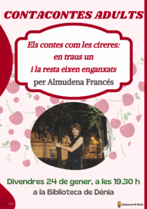 Cuenta cuentos para adultos, Els contes com les cireres: en traus un i la resta, eixen enganxats, por Almudena Francés.Os esperamos el viernes 24 de enero, a las 19.30 h, en la Biblioteca de Dénia (c/ de Sant Josep, 6)