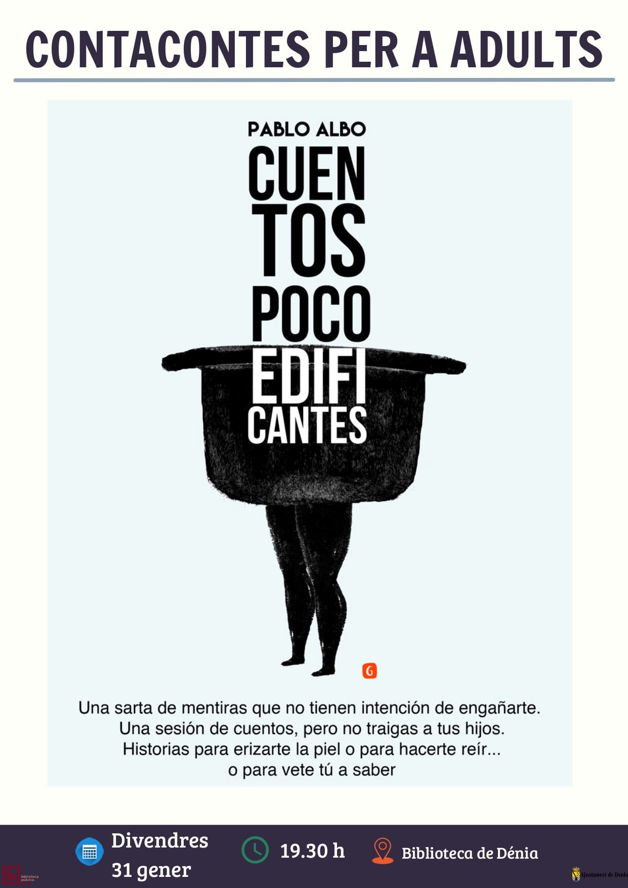 Cuenta cuentos para adultos, Cuentos poco edificantes, por Pablo Albo.Os esperamos el viernes 31 de enero a las 19.30 h, en la Biblioteca de Dénia (c/ de Sant Josep, 6)