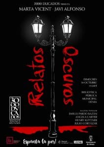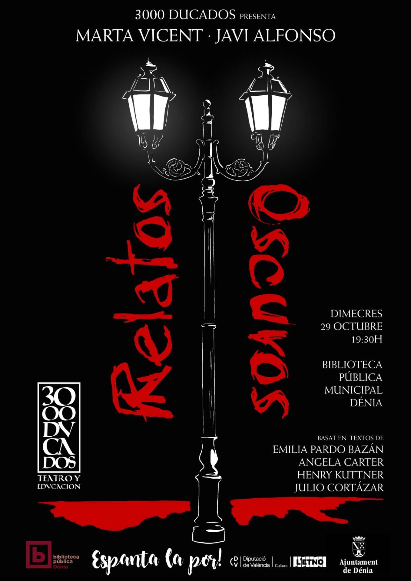 Cuenta cuentos para público adulto, Relatos oscuros, con Marta Vicent i Javi Alfonso (3000 Ducados Teatro y Educación).Basado en textos de Emilia Pardo Bazán, Angela Carter, Henry Kuttner y Julio Cortázar.Dentro de la campaña Espanta la por!Miércoles 29 de octubre, a las 19.30 h, en la Biblioteca de Dénia (c/ de Sant Josep, 6)