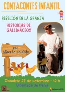 Cuentacuentos infantil, Rebelión en la granja, con Alberto Celdrán (Cia Fàbrica de paraules).Para público familiar.Os esperamos el sábado 27 de septiembre, a las 12 h, en la Biblioteca de Dénia (c/ de Sant Josep, 6)