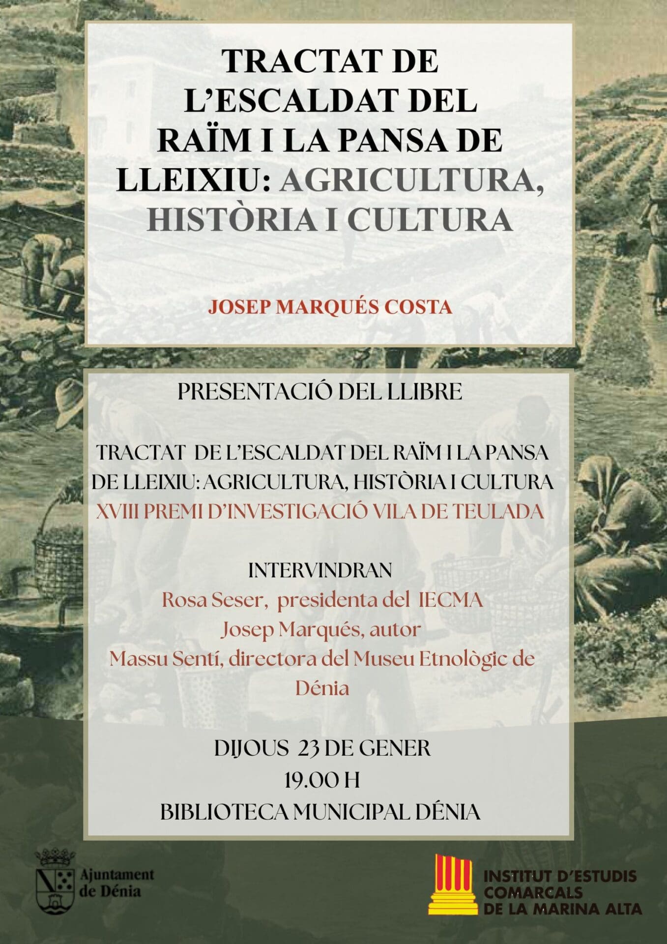 Presentación del libro El tractat de l’estacaldat del raïm i la pansa de lleixiu; agricultura, història i cultura a cargo del autor, Josep Marqués Costa. Este libro inaugura una nueva línea de investigación dedicada al estudio del escaldat de la uva valenciana, situándolo en el contexto de una tradición ancestral compartida que ha perdurado durante siglos en varias regiones del Mediterráneo y el Oriente Medio. Además, muestra como esta práctica se ha adaptado y expandido a otras partes del mundo.El estudio desmiente el tópico que atribuía la exclusividad de esta técnica a la comarca de la Marina Alta, una idea que algunos autores habían sostenido erróneamente. La investigación demuestra que el escaldat de la uva es una técnica de gran relevancia histórica que ha sobrevivido en microrregiones específicas del planeta donde este pretratamiento favorecía el proceso de secado. Por primera vez, se establecen comparaciones con otras prácticas etnográficas paralelas, ofreciendo una visión más global e integrada de esta tradición.Intervendrán Rosa Seser, presidenta del IECMA y Massu Sentí, directora del Museo Etnológico de Dénia.