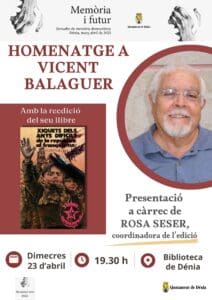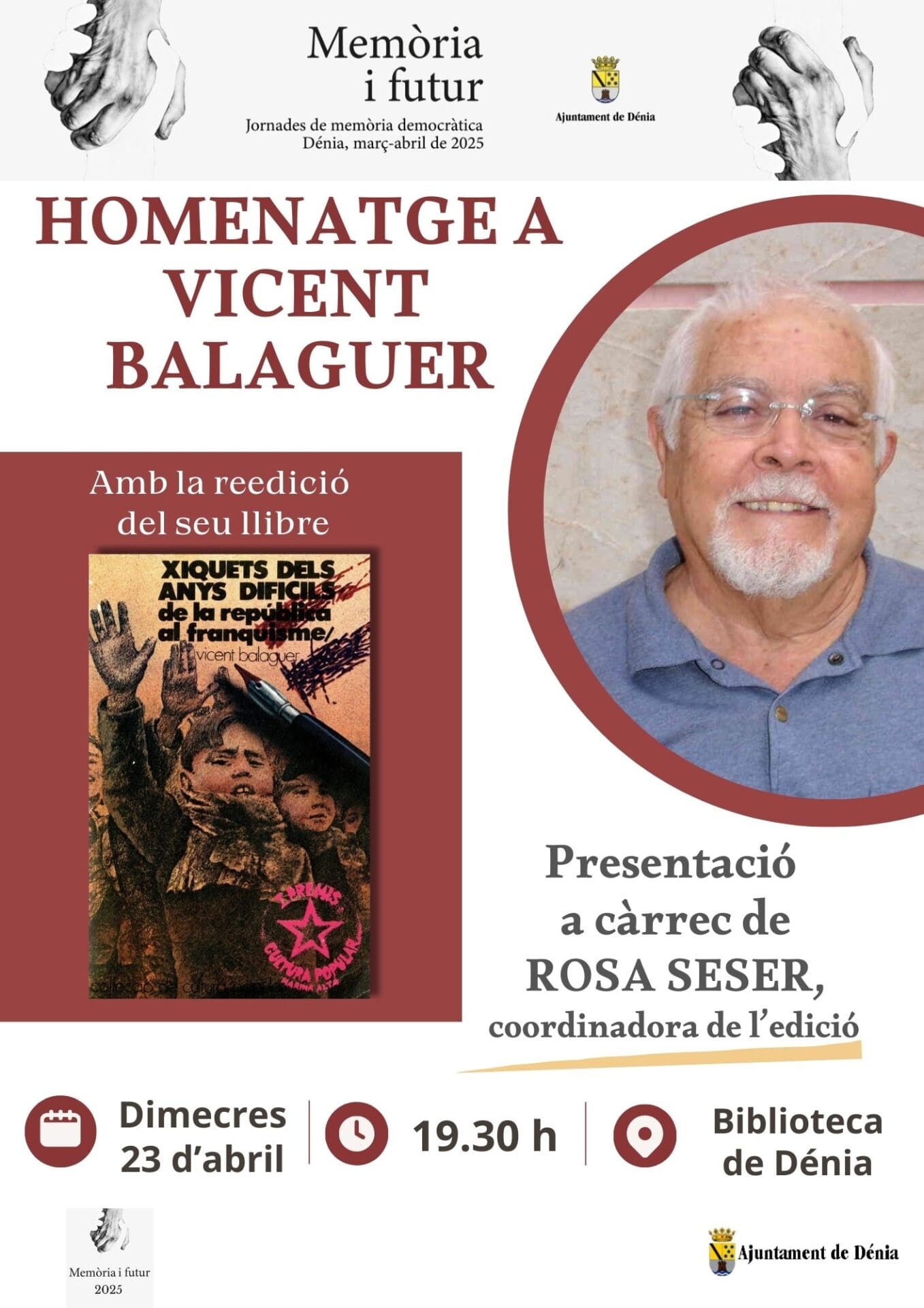 Homenaje a Vicent BalaguerCon la reedición de su libro: “Xiquets dels anys difícils, de la república al franquisme”. Presentación a cargo de Rosa Seser, coordinadora de la edición.El Día del Libro queremos recordar a Vicent Balaguer, siempre vinculado a la cultura y en su Dénia. “Niños de los años difíciles”, publicada en 1978, fue una obra pionera de la memoria democrática. Balaguer retrató su niñez en la Dénia de la República, de la Guerra Civil y de la inmediata Posguerra, con la lucidez y el humor que le caracterizaba. La obra se ha revisado y se han añadido una introducción y unos recursos didácticos. Un texto de gran amenidad para todos los públicos. Miércoles 23 de abril, Dia del libro, a las 19.30 hBiblioteca PúblicaDentro del ciclo de Jornades de memòria democràtica: Memòria i futur 2025