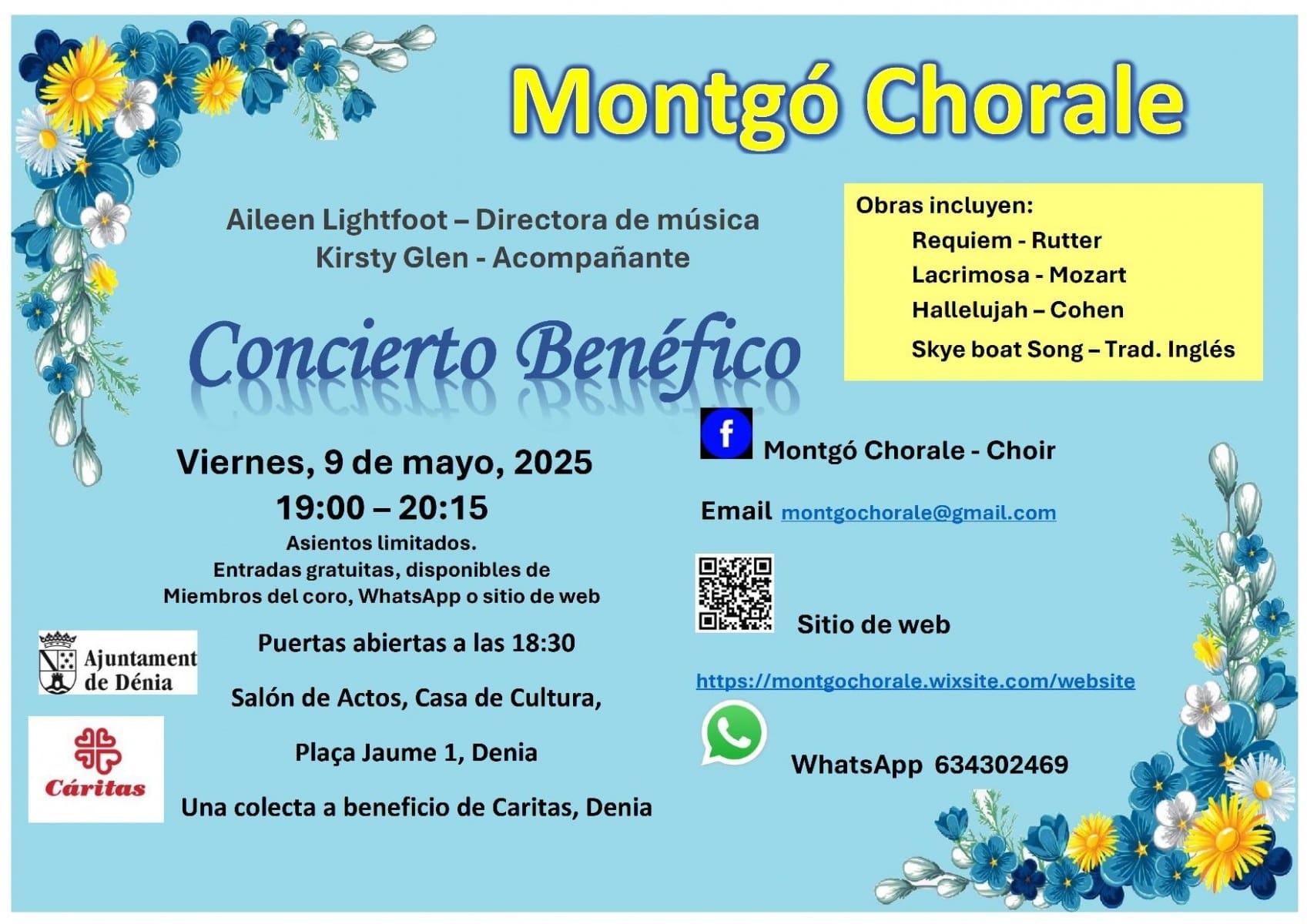 A favor de “Cáritas”Dir.: Aileen Lightfoot. Acompanyant / acompañante: Kirsty GlenObras: Requiem – Rutter, Lacrimosa – Mozart, Hallelujah – Cohen, Skye boat Song – Trad. Inglés.