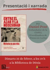 Presentación del libro Entre el azar y la necesidad. Historia de una vida, de Daniel Pont Martín e Ignacio González Sánchez (Virus Editorial). Con una conversación posterior.Martes 25 de febrero, a las 19 h, en la Biblioteca de Dénia (c/ de Sant Josep, 6)Testimonio histórico y social que recoge las memorias de Daniel Pont Martín, cofundador de la Coordinadora de Presos en Lucha (COPEL) y figura clave en las luchas sociales y anticarcelarias en España. Ignacio González Sánchez, sociólogo y profesor de Criminología, aporta el enfoque académico, que enriquece el testimonio personal