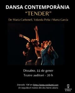 TENDER de María Carbonell, Yolanda Peña y Marta GarcíaModus vivendi Dansa es una asociación que nace de la necesidad de ampliar el proyecto del Estudio de Danza María Carbonell con 40 años de trayectoria dedicado a la docencia. Con la creación de este proyecto paralelo, María, Yolanda y Marta buscan las líneas de comunicación entre la profesionalización, la creación y la docencia. «TENDER» es un ciclo, es un espacio/tiempo donde todo vuelve a suceder. Tres cuerpos que se reencuentran, trayectorias vitales que se juntan en un punto y aparece un común. La idea de espiral como el encuentro y desencuentro. Las ganas de vibrar y de sumergir a la espectadora en un viaje continuo y circular.Entrada: 10 € en https://notikumi.com En taquilla: dos horas antes.Organiza: Asociación Cultural Modus Vivendi Dansa. Colabora: Ajuntament de Dénia
