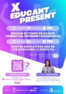 17 de septiembre a las 19h en la Casa de la Cultura de Dénia (Pl. Jaime I, s/n):“EDUCAR EN TIEMPO DE CAMBIOS: CONECTAR, ENTENDER Y ACOMPAÑAR”.Se ofrecerán herramientas prácticas para favorecer una crianza consciente y respetuosa, poniendo límites en un contexto de cambios sociales y digitales acelerados. Se reflexionará sobre las necesidades emocionales de los hijos e hijas y como establecer vínculos saludables. También se darán claves para entender y acompañar desde el respeto y fomentar la comunicación.INSCRIPCIÓN Y ASISTENCIAPara participar es necesario realizar inscripción previa, indicando NOMBRE, APELLIDOS, TELÉFONO y CORREO:Escaneando el código QR disponible en el cartel oficialSiguiendo el enlace: https://forms.gle/K8jZ3ZUjzSUcoocn9Por correo a upccadenia@ayto-denia.esPor WhatsApp al 628 076 449Mediante mensaje directo en las redes sociales de la UPCCA (@upccadenia)
