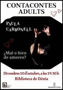 Erzählung für Erwachsene, ¿Mal o bien de amores?, mit Paula Carbonell.Freitag, 10. Oktober, um 19.30 Uhr, in der Stadtbibliothek (c/ de Sant Josep, 6).