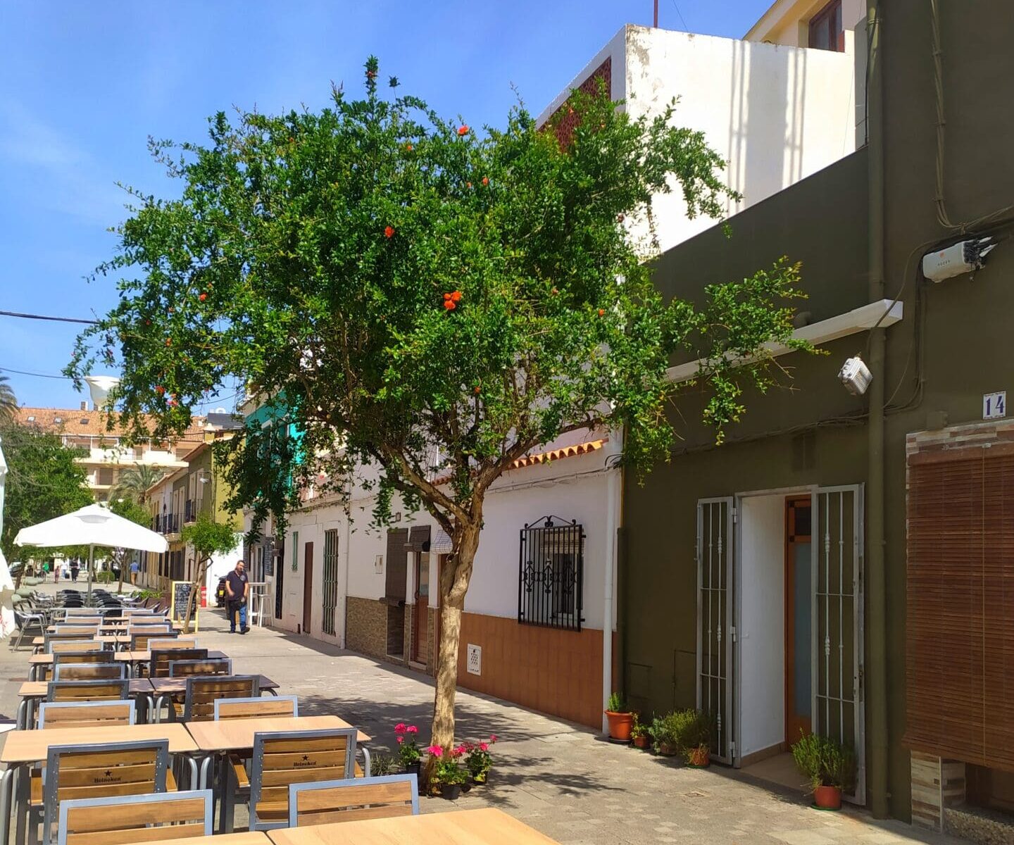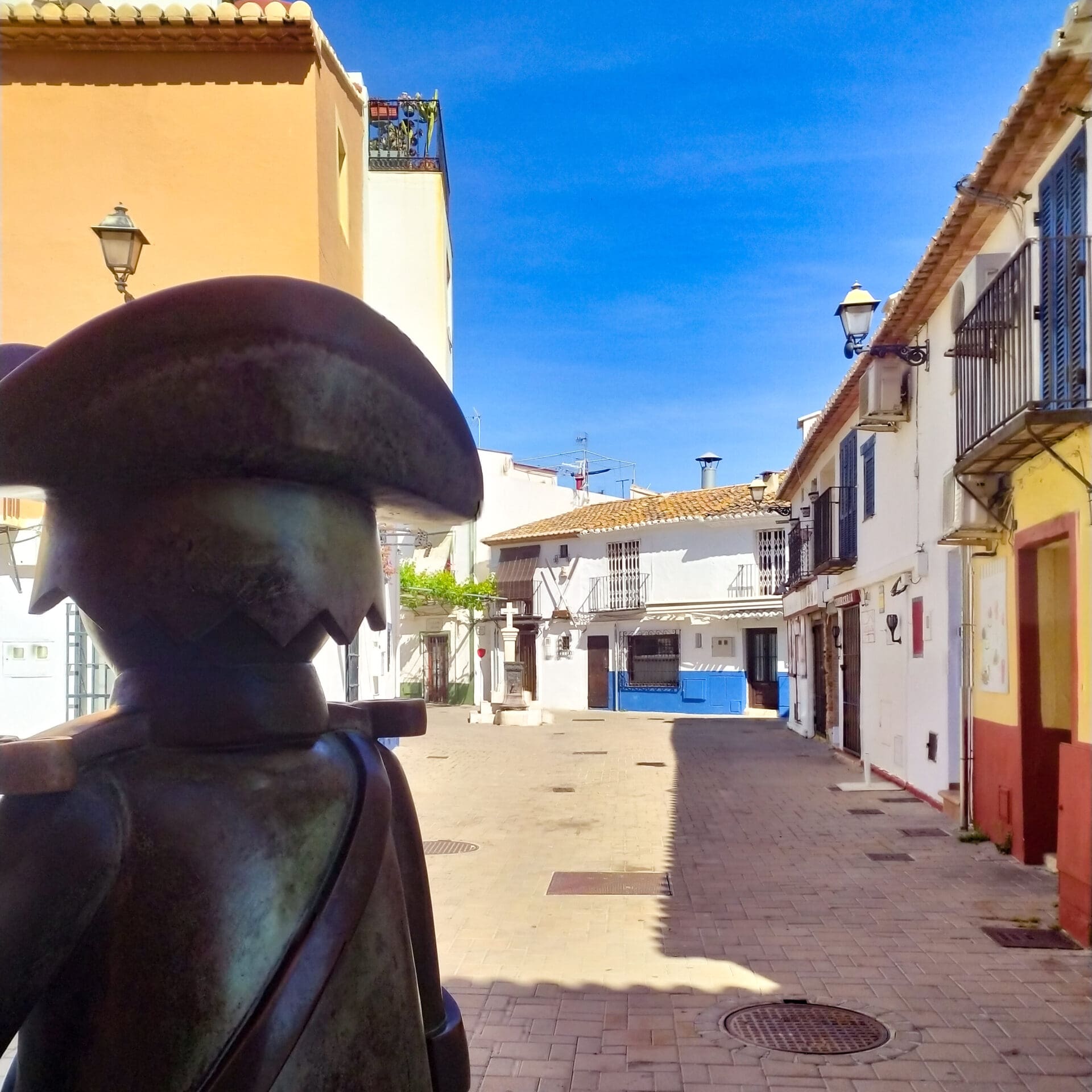 Today, Baix la Mar is noted for its narrow, pedestrian streets, brightly painted low houses and unmistakable Mediterranean atmosphere. Landmarks include the Plaza de Sant Antoni and the Placeta de la Creu, where a stone cross and an 18th-century devotional tile stand. A curious urban detail is the life-size bronze sculpture representing a Playmobil, installed as a tribute to the filming in Dénia of the movie Captain Jones.