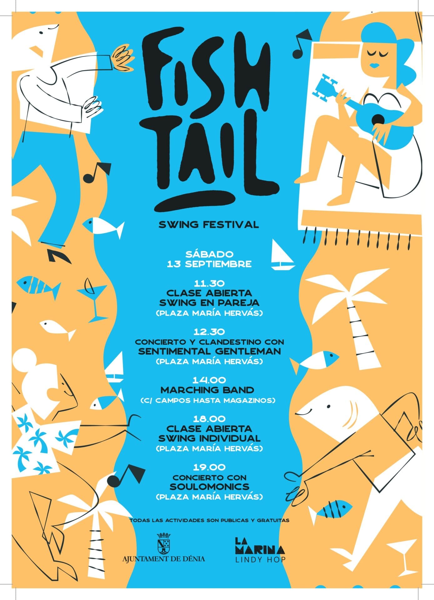 11.30 h – Atelier clandestin ouvert. Classe ouverte de swing en couple12.30 h – concert et danse clandestineGENTLEMAN SENTIMENTAL 14.00 h – Défilé avec la BANDE DE MARCHE Itinéraire : calle Diana, calle la Mar, calle Pont à los Magazinos.18.00 h – Atelier Classe ouverte de swing individuel19.00 h – concertSOULOMONICOrganisé par : Mairie de Dénia. Culture. La Marina Lindy Hop.