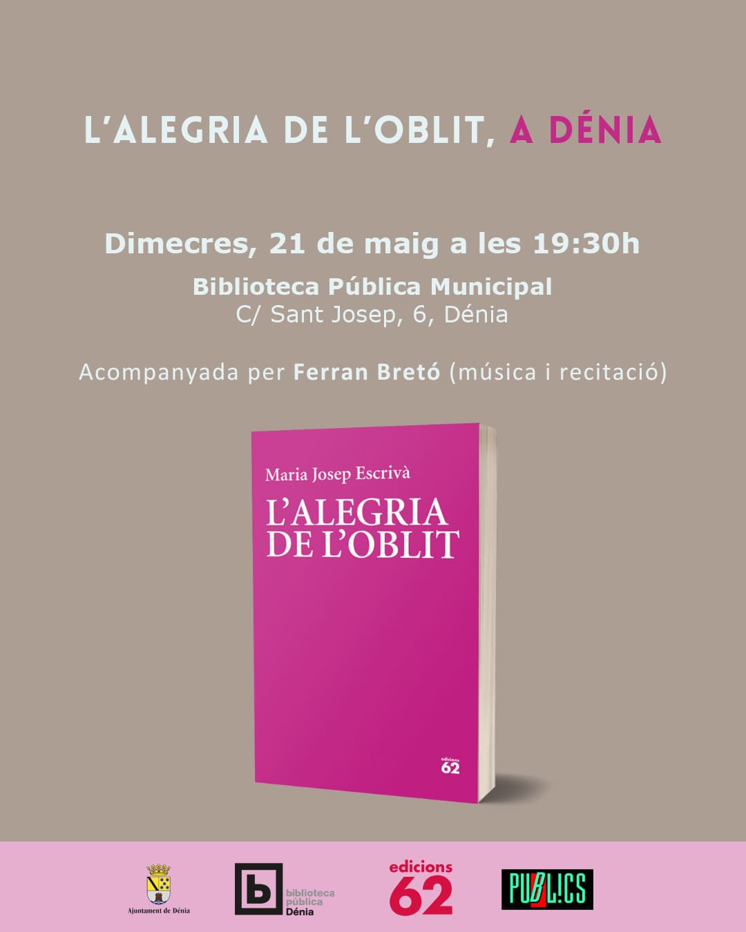 Présentation-récital de L’alegria de l’oblit (Edicions 62), de Maria Josep Escrivà. Mercredi 21 mai, à 19 h 30, à la Bibliothèque publique (c/ de Sant Josep, 6).