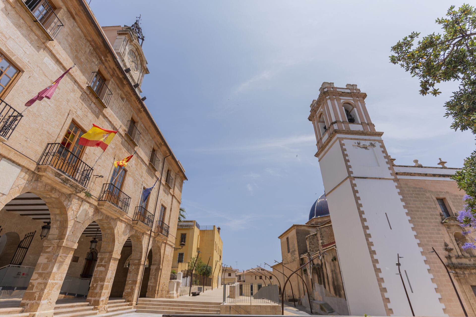Situé sur la Plaza de la Constitución, en plein centre historique, l’hôtel de ville de Dénia est un exemple remarquable d’architecture civique néoclassique, avec sa façade en pierre brute, ses colonnes et son élégant fronton triangulaire. Bien que ses fondations remontent au XVIIe siècle, ce que l’on peut voir aujourd’hui est le résultat d’une profonde réforme entre 1812 et 1848, qui a défini son style actuel. Des inscriptions romaines et des piédestaux de l’ancien forum de Dianium sont encore visibles sur la façade et les escaliers.