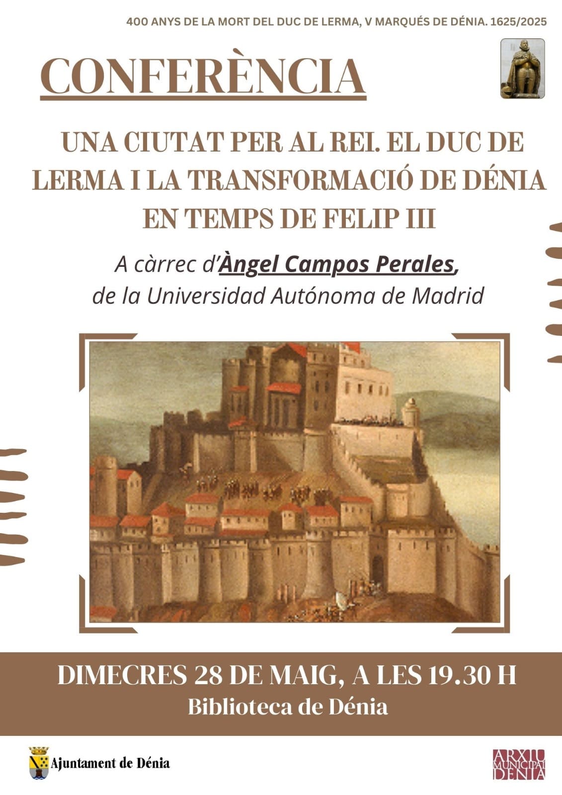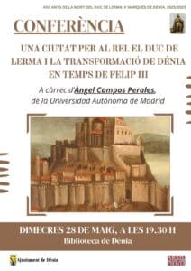 Conferència Una ciutat per al rei. El duc de Lerma i la transformació de Dénia en temps de Felip III, per Àngel Campos Perales, de la Universitat Autònoma de Madrid** Al valencià. Dimecres 28 de maig, a les 19.30 h, a la Biblioteca de Dénia (c/ de Sant Josep, 6)