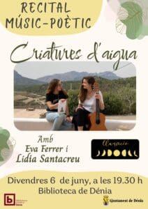 Recital musicopoètic, Criatures d’Aigua, per Eva Ferrer i Lídia Santacreu, de Llunació. Divendres 6 de juny, a les 19.30 h, a la Biblioteca Pública (c/ de Sant Josep, 6)